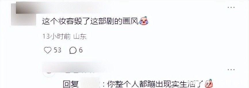 剧中她的妆容耐久是全包眼线,又黑又粗的眉毛,眼妆也都化得极端全,尤其是在破败的院子里语言时,不雅众看着全身陡立的不悠然,违和感满满。