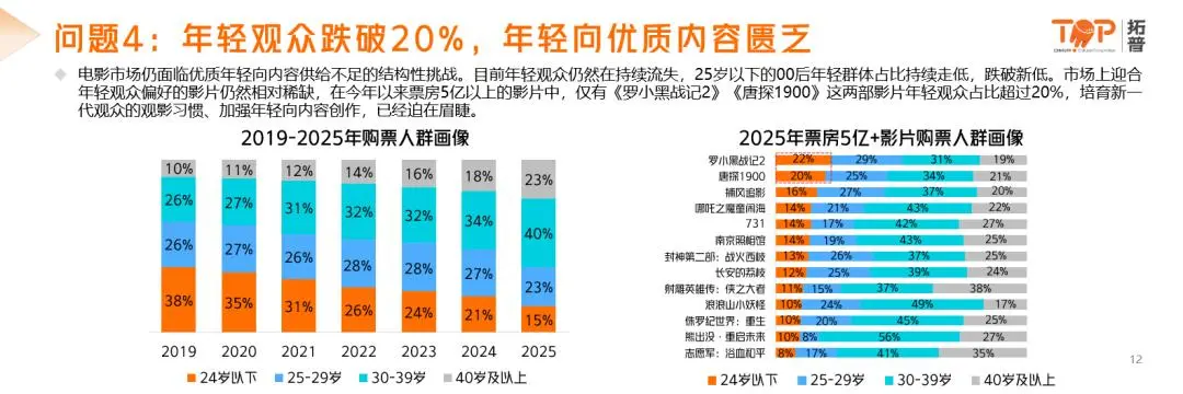 凭证11月份拓普数据《2025年中国电影市集知悉》炫耀,2019年到2025年购票东说念主群画像,24岁以下不雅众从38%跌至15%。年青不雅众放弃电影有两点原因,一是莫得可看的,内容上对年青不雅众诱骗力不及。二是营销上诱骗不了年青不雅众,所谓的营销物料变成了“信息垃圾”。