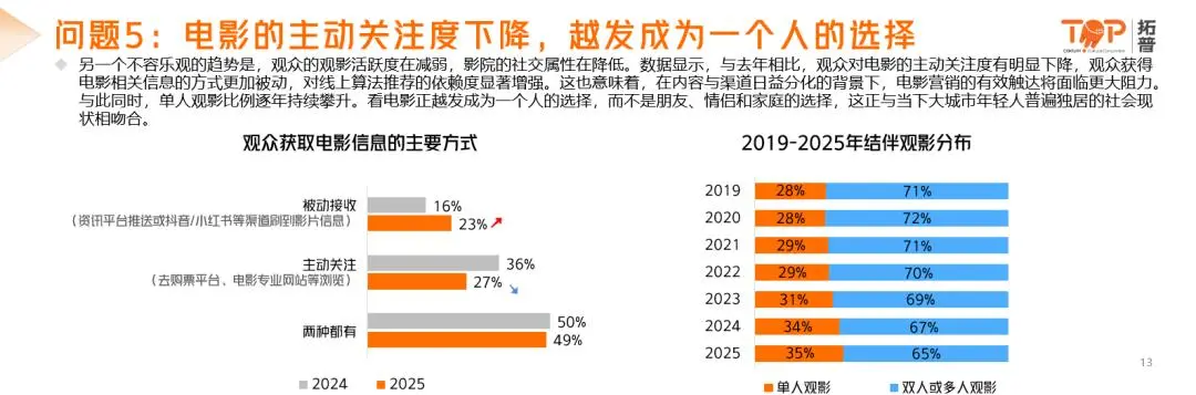 在购票东说念主群画像上,另外一个数据值得留神,就是影院的酬酢属性在镌汰。不异是凭证11月份拓普数据《2025年中国电影市集知悉》炫耀,2019年到2025年,单东说念主不雅影从28%涨到了35%。前两年市集反复说起影院不雅影的“庆典感”和“酬酢感”,但推行数据上却是单东说念主不雅影比例捏续增高。
