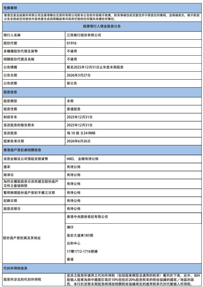 分成决策落地。江西银行告示,将于2026年8月25日派发2025年度末期股息,每10股派发现款0.34元。