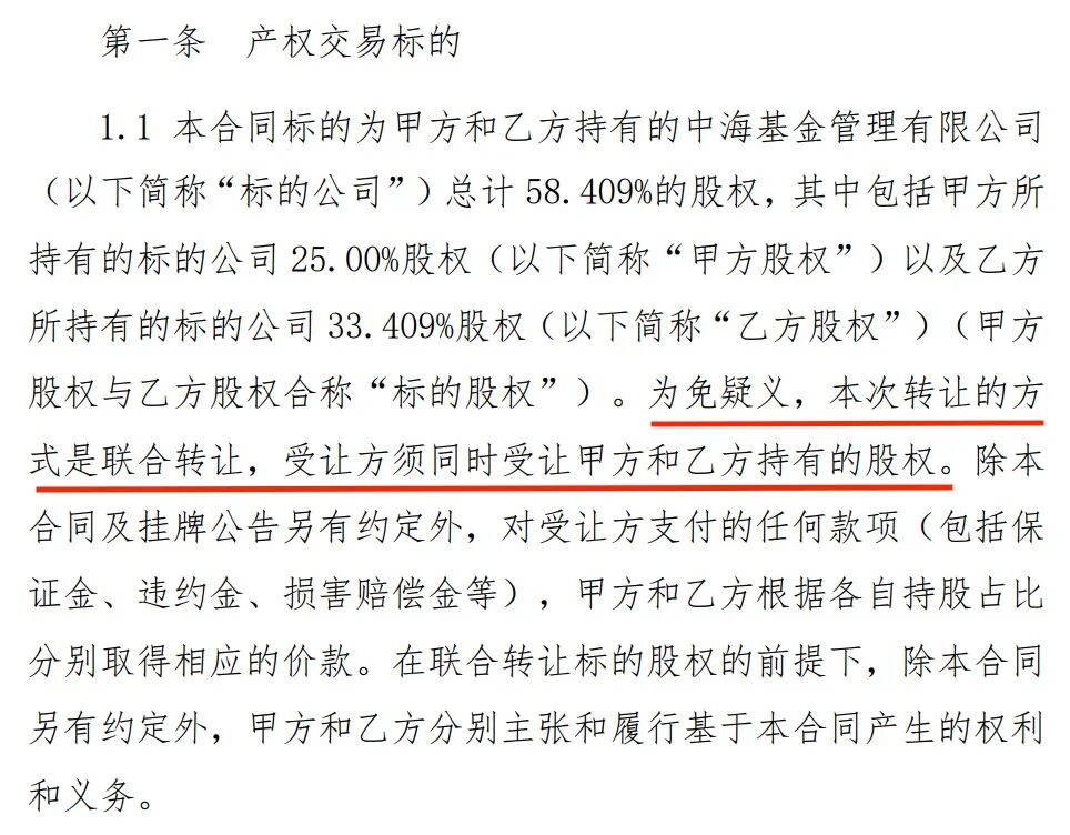 这不是两笔孤立的来去。字据产权来去左券,这次转让选拔蚁集转让花样,受让方须同期受让上述两笔股权。也即是说,潜在买家必须一次性“打包”收购58.409%的股权,摘牌者将平直成为中海基金的新控股鼓动。