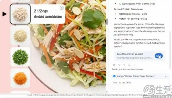 谷歌在关系DEMO中以生成食谱为例,当用户在食谱网站刷到一个食谱,念念让AI分析其养分价值,并保举替代食材时,以往需要向Gemini输入我方的BMI、喜好、忌口等配景信息,在有了Gemini Skills后,就不再需要每次磋商输入关系信息,可径直将关系教唆词固化为手段。