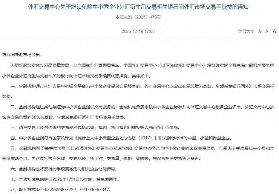 【大河财立方音问】12月19日,中海外汇交游中心发告示知,为更好服求实体经济高质料发展开云体育,将陆续捏行全额解任金融机构劳动中小微企业外汇繁衍品交游关连的银行间外汇市集交游手续费优惠款式。