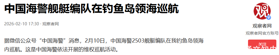 2026-02-10 17:30·不雅察者网 中国海警舰艇编队在垂纶岛领海巡航